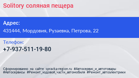 Solitory, соляная пещера по адресу 431444, Мордовия, Рузаевка, Петрова, 22 в дальнейшем Организация, размещена в следующих категориях: