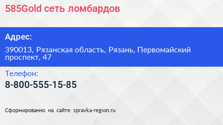 585Gold, сеть ломбардов по адресу 390013, Рязанская область, Рязань, Первомайский проспект, 47 в дальнейшем Организация, размещена в следующих категориях:
