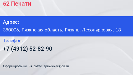 62 Печати по адресу 390006, Рязанская область, Рязань, Лесопарковая, 18 в дальнейшем Организация, размещена в следующих категориях: