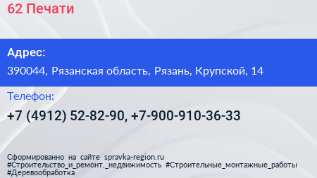 62 Печати по адресу 390044, Рязанская область, Рязань, Крупской, 14 в дальнейшем Организация, размещена в следующих категориях: