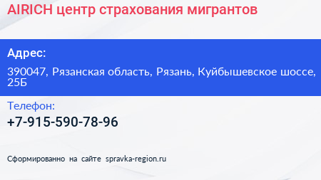 AIRICH, центр страхования мигрантов по адресу 390047, Рязанская область, Рязань, Куйбышевское шоссе, 25Б в дальнейшем Организация, размещена в следующих категориях: