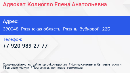 Адвокат Колиогло Елена Анатольевна по адресу 390048, Рязанская область, Рязань, Зубковой, 22Б в дальнейшем Организация, размещена в следующих категориях: