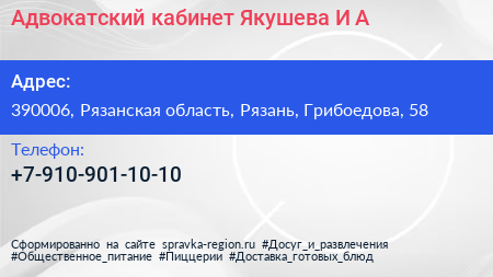 Адвокатский кабинет Якушева И.А. по адресу 390006, Рязанская область, Рязань, Грибоедова, 58 в дальнейшем Организация, размещена в следующих категориях:
