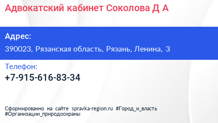 Адвокатский кабинет Соколова Д.А. по адресу 390023, Рязанская область, Рязань, Ленина, 3 в дальнейшем Организация, размещена в следующих категориях: