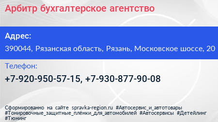 Арбитр, бухгалтерское агентство по адресу 390044, Рязанская область, Рязань, Московское шоссе, 20 в дальнейшем Организация, размещена в следующих категориях: