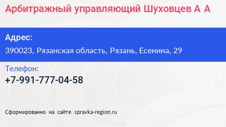 Арбитражный управляющий Шуховцев А.А. по адресу 390023, Рязанская область, Рязань, Есенина, 29 в дальнейшем Организация, размещена в следующих категориях: