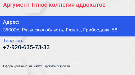 Аргумент Плюс, коллегия адвокатов по адресу 390006, Рязанская область, Рязань, Грибоедова, 58 в дальнейшем Организация, размещена в следующих категориях: