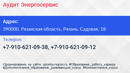 Аудит-Энергосервис по адресу 390000, Рязанская область, Рязань, Садовая, 18 в дальнейшем Организация, размещена в следующих категориях: