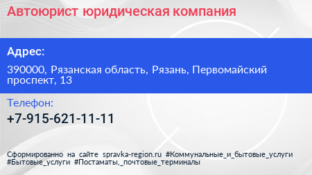 Автоюрист, юридическая компания по адресу 390000, Рязанская область, Рязань, Первомайский проспект, 13 в дальнейшем Организация, размещена в следующих категориях: