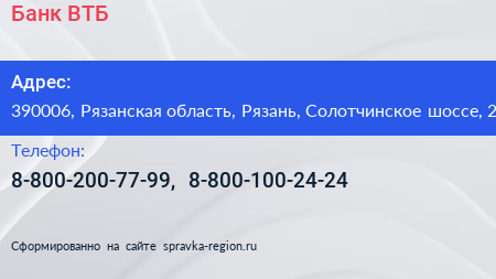 Банк ВТБ по адресу 390006, Рязанская область, Рязань, Солотчинское шоссе, 2 в дальнейшем Организация, размещена в следующих категориях: