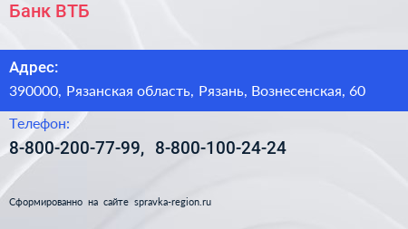 Банк ВТБ по адресу 390000, Рязанская область, Рязань, Вознесенская, 60 в дальнейшем Организация, размещена в следующих категориях: