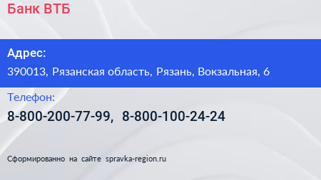 Банк ВТБ по адресу 390013, Рязанская область, Рязань, Вокзальная, 6 в дальнейшем Организация, размещена в следующих категориях: