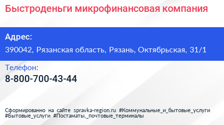 Быстроденьги, микрофинансовая компания по адресу 390042, Рязанская область, Рязань, Октябрьская, 31/1 в дальнейшем Организация, размещена в следующих категориях: