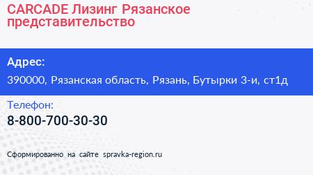 CARCADE Лизинг, Рязанское представительство по адресу 390000, Рязанская область, Рязань, Бутырки 3-и, ст1д в дальнейшем Организация, размещена в следующих категориях: