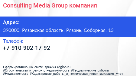 Consulting Media Group, компания по адресу 390000, Рязанская область, Рязань, Соборная, 13 в дальнейшем Организация, размещена в следующих категориях: