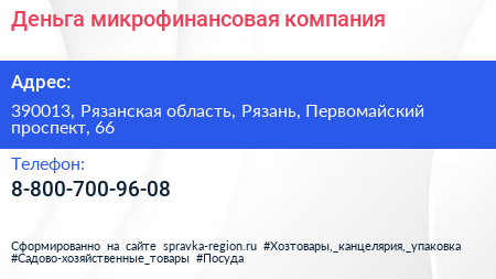 Деньга, микрофинансовая компания по адресу 390013, Рязанская область, Рязань, Первомайский проспект, 66 в дальнейшем Организация, размещена в следующих категориях: