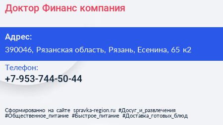 Доктор Финанс, компания по адресу 390046, Рязанская область, Рязань, Есенина, 65 к2 в дальнейшем Организация, размещена в следующих категориях:
