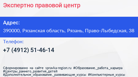 Экспертно-правовой центр по адресу 390000, Рязанская область, Рязань, Право-Лыбедская, 38 в дальнейшем Организация, размещена в следующих категориях: