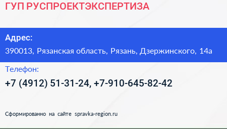 ГУП РУСПРОЕКТЭКСПЕРТИЗА по адресу 390013, Рязанская область, Рязань, Дзержинского, 14а в дальнейшем Организация, размещена в следующих категориях: