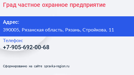 Град, частное охранное предприятие по адресу 390005, Рязанская область, Рязань, Стройкова, 11 в дальнейшем Организация, размещена в следующих категориях:
