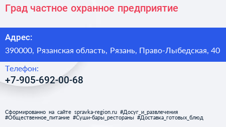 Град, частное охранное предприятие по адресу 390000, Рязанская область, Рязань, Право-Лыбедская, 40 в дальнейшем Организация, размещена в следующих категориях: