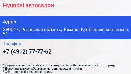 Hyundai, автосалон по адресу 390047, Рязанская область, Рязань, Куйбышевское шоссе, 51 в дальнейшем Организация, размещена в следующих категориях: