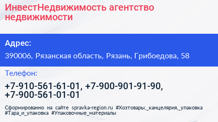 ИнвестНедвижимость, агентство недвижимости по адресу 390006, Рязанская область, Рязань, Грибоедова, 58 в дальнейшем Организация, размещена в следующих категориях: