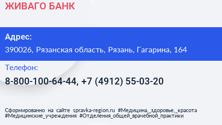 ЖИВАГО БАНК по адресу 390026, Рязанская область, Рязань, Гагарина, 164 в дальнейшем Организация, размещена в следующих категориях: