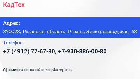 КадТех по адресу 390023, Рязанская область, Рязань, Электрозаводская, 63 в дальнейшем Организация, размещена в следующих категориях: