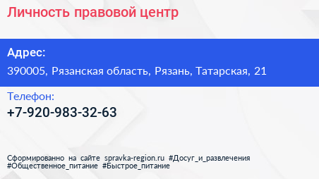 Личность, правовой центр по адресу 390005, Рязанская область, Рязань, Татарская, 21 в дальнейшем Организация, размещена в следующих категориях: