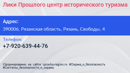 Лики Прошлого, центр исторического туризма по адресу 390006, Рязанская область, Рязань, Свободы, 4 в дальнейшем Организация, размещена в следующих категориях: