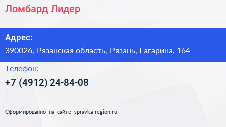 Ломбард-Лидер по адресу 390026, Рязанская область, Рязань, Гагарина, 164 в дальнейшем Организация, размещена в следующих категориях: