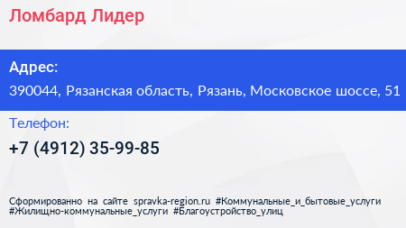 Ломбард-Лидер по адресу 390044, Рязанская область, Рязань, Московское шоссе, 51 в дальнейшем Организация, размещена в следующих категориях: