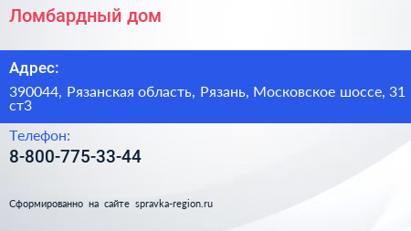 Ломбардный дом по адресу 390044, Рязанская область, Рязань, Московское шоссе, 31 ст3 в дальнейшем Организация, размещена в следующих категориях: