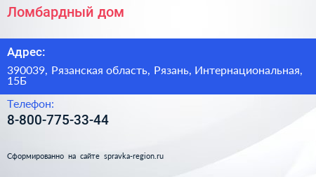 Ломбардный дом по адресу 390039, Рязанская область, Рязань, Интернациональная, 15Б в дальнейшем Организация, размещена в следующих категориях: