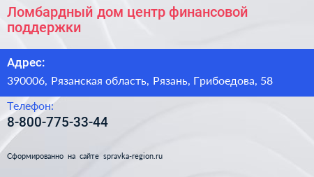 Ломбардный дом, центр финансовой поддержки по адресу 390006, Рязанская область, Рязань, Грибоедова, 58 в дальнейшем Организация, размещена в следующих категориях: