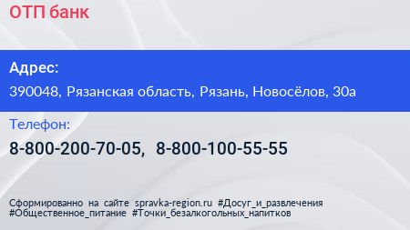 ОТП банк по адресу 390048, Рязанская область, Рязань, Новосёлов, 30а в дальнейшем Организация, размещена в следующих категориях: