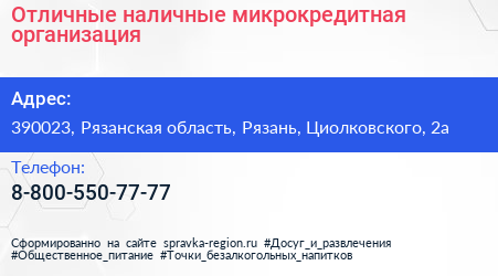 Отличные наличные, микрокредитная организация по адресу 390023, Рязанская область, Рязань, Циолковского, 2а в дальнейшем Организация, размещена в следующих категориях: