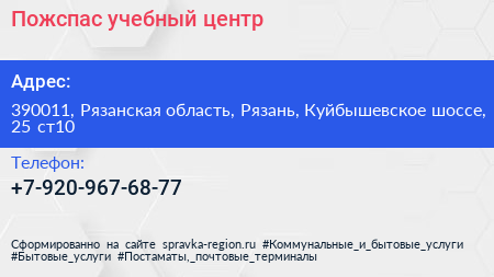 Пожспас, учебный центр по адресу 390011, Рязанская область, Рязань, Куйбышевское шоссе, 25 ст10 в дальнейшем Организация, размещена в следующих категориях: