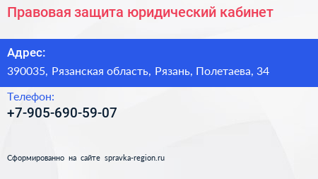 Правовая защита, юридический кабинет по адресу 390035, Рязанская область, Рязань, Полетаева, 34 в дальнейшем Организация, размещена в следующих категориях: