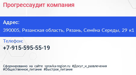 Прогрессаудит, компания по адресу 390005, Рязанская область, Рязань, Семёна Середы, 29 к1 в дальнейшем Организация, размещена в следующих категориях: