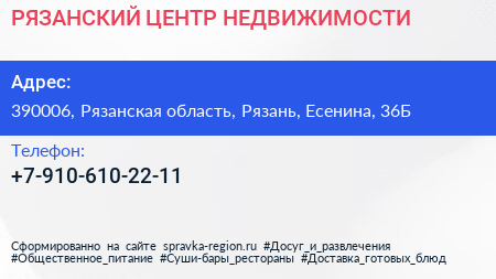 РЯЗАНСКИЙ ЦЕНТР НЕДВИЖИМОСТИ по адресу 390006, Рязанская область, Рязань, Есенина, 36Б в дальнейшем Организация, размещена в следующих категориях: