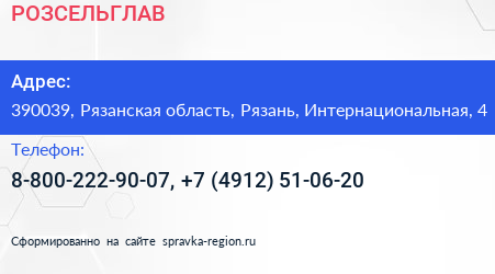РОЗСЕЛЬГЛАВ по адресу 390039, Рязанская область, Рязань, Интернациональная, 4 в дальнейшем Организация, размещена в следующих категориях: