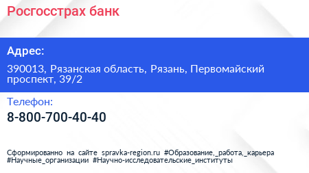 Росгосстрах банк по адресу 390013, Рязанская область, Рязань, Первомайский проспект, 39/2 в дальнейшем Организация, размещена в следующих категориях:
