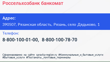 Россельхозбанк, банкомат по адресу 390507, Рязанская область, Рязань, село Дядьково, 1 в дальнейшем Организация, размещена в следующих категориях: