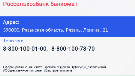 Россельхозбанк, банкомат по адресу 390000, Рязанская область, Рязань, Ленина, 21 в дальнейшем Организация, размещена в следующих категориях: