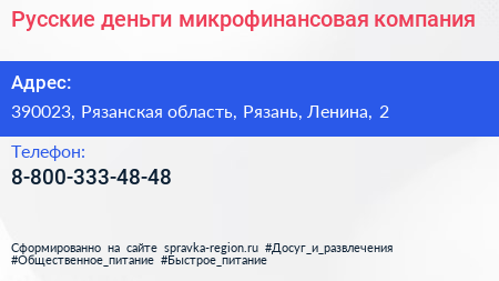 Русские деньги, микрофинансовая компания по адресу 390023, Рязанская область, Рязань, Ленина, 2 в дальнейшем Организация, размещена в следующих категориях: