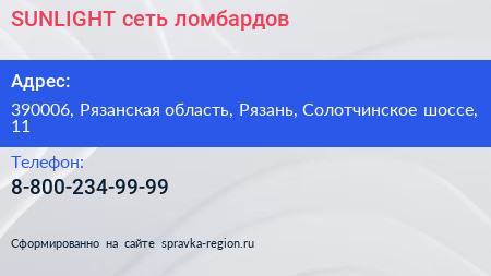 SUNLIGHT, сеть ломбардов по адресу 390006, Рязанская область, Рязань, Солотчинское шоссе, 11 в дальнейшем Организация, размещена в следующих категориях:
