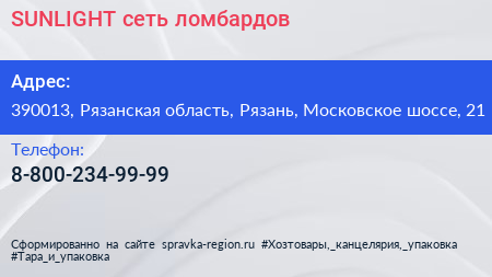 SUNLIGHT, сеть ломбардов по адресу 390013, Рязанская область, Рязань, Московское шоссе, 21 в дальнейшем Организация, размещена в следующих категориях: