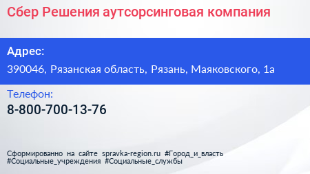 Сбер Решения, аутсорсинговая компания по адресу 390046, Рязанская область, Рязань, Маяковского, 1а в дальнейшем Организация, размещена в следующих категориях: